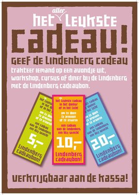 Verwen iemand met een mooie voorstelling, een diner of een cursus/workshop dans, theater, muziek, beeldende kunst of schrijven met de Lindenberg Cadeaubon! De ontvanger van de bon kan zelf kiezen waarvoor hij of zij hem gebruikt.